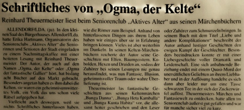 Sehr geehrter Herr Theuermeister, ich habe Ihre Keltenmärchen Bunga heta kamballa als Buch gekauft und dauernd überlegt, wie ich Ihnen für diese schönen Märchen einmal danken kann. Auch habe ich mir gedacht, die sind so schön, die schicke ich zu meinen Verwandten nach Argentinien. Besten Dank, Ihre Harriet.